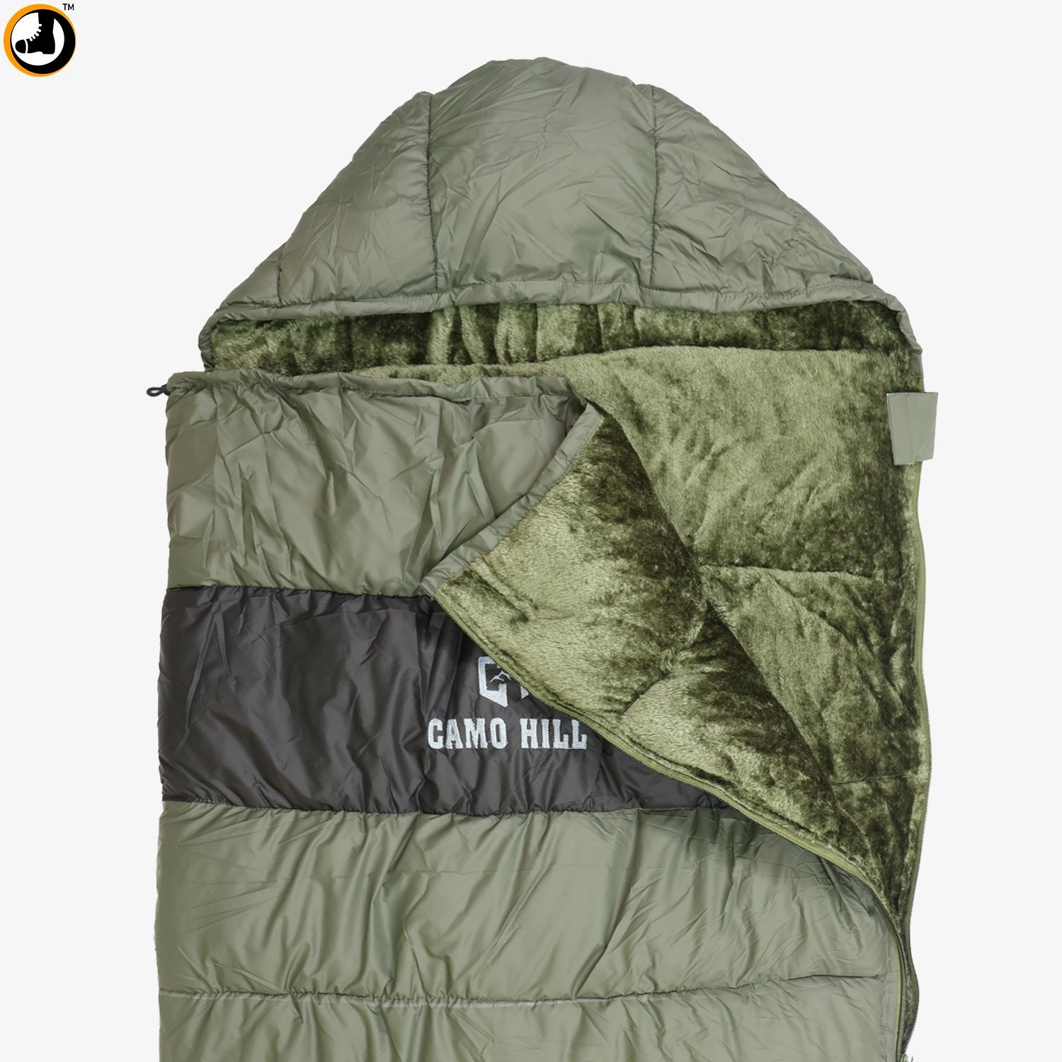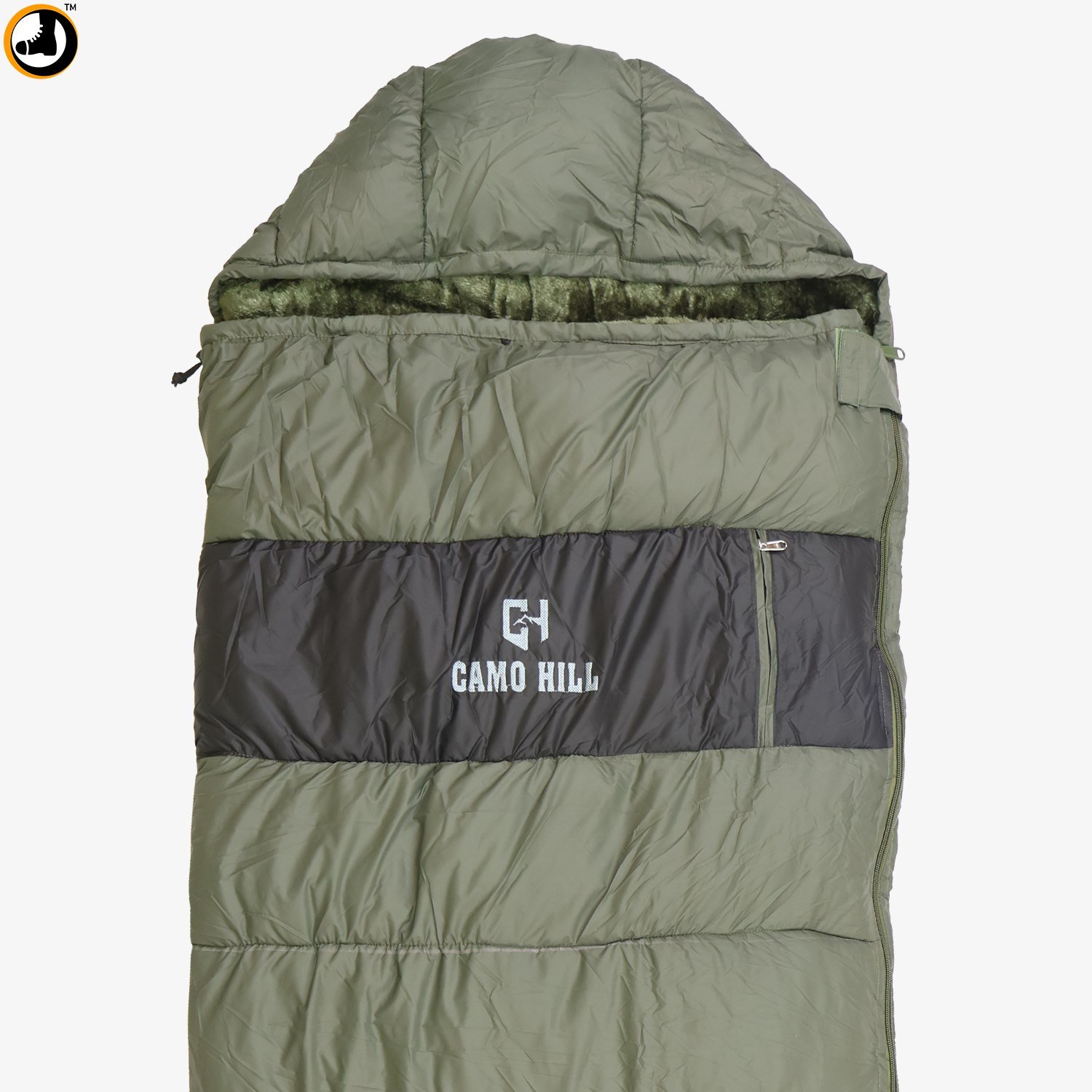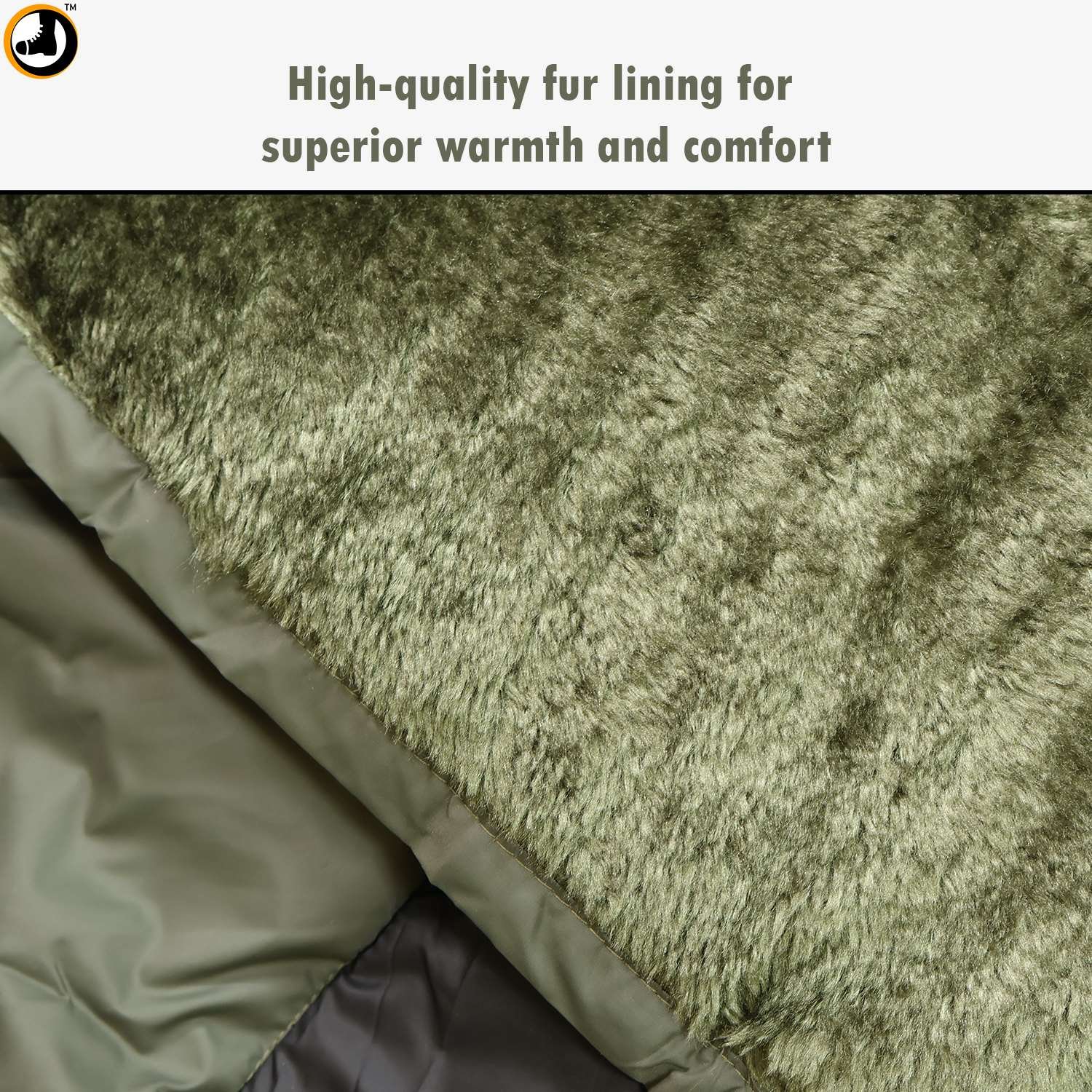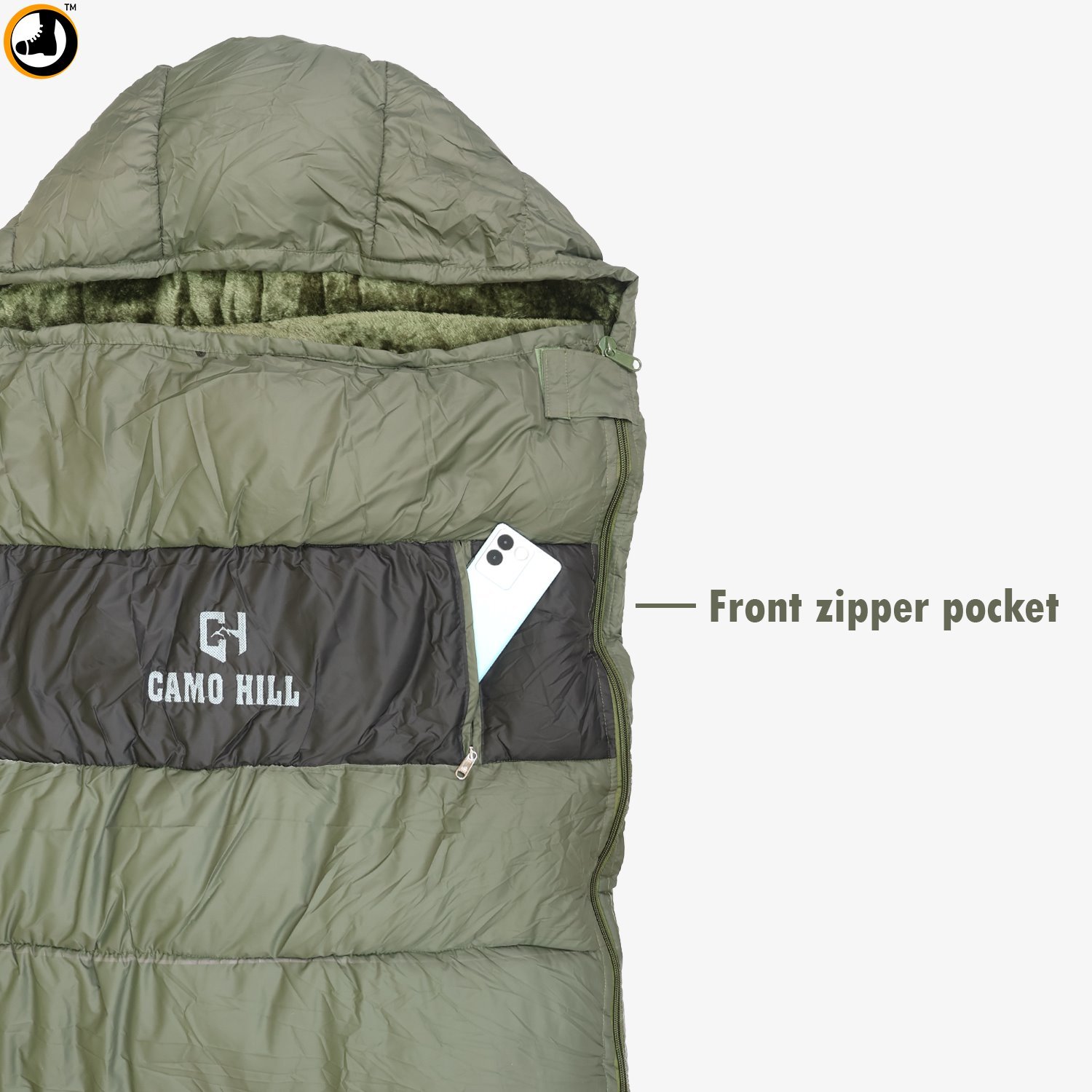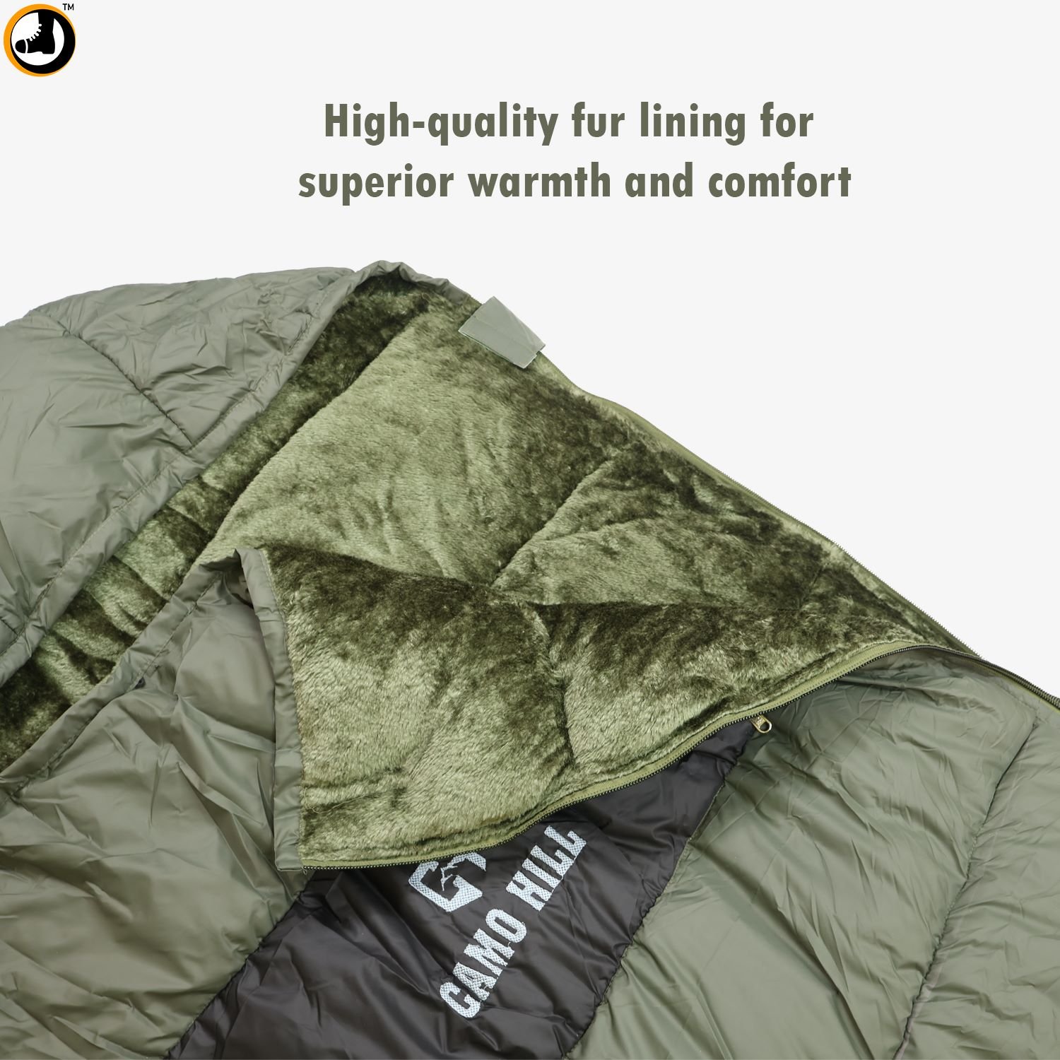 Camo Hill Olive Green Sleeping Bag with Fur Lining, Dual Zippers & Utility Pocket
