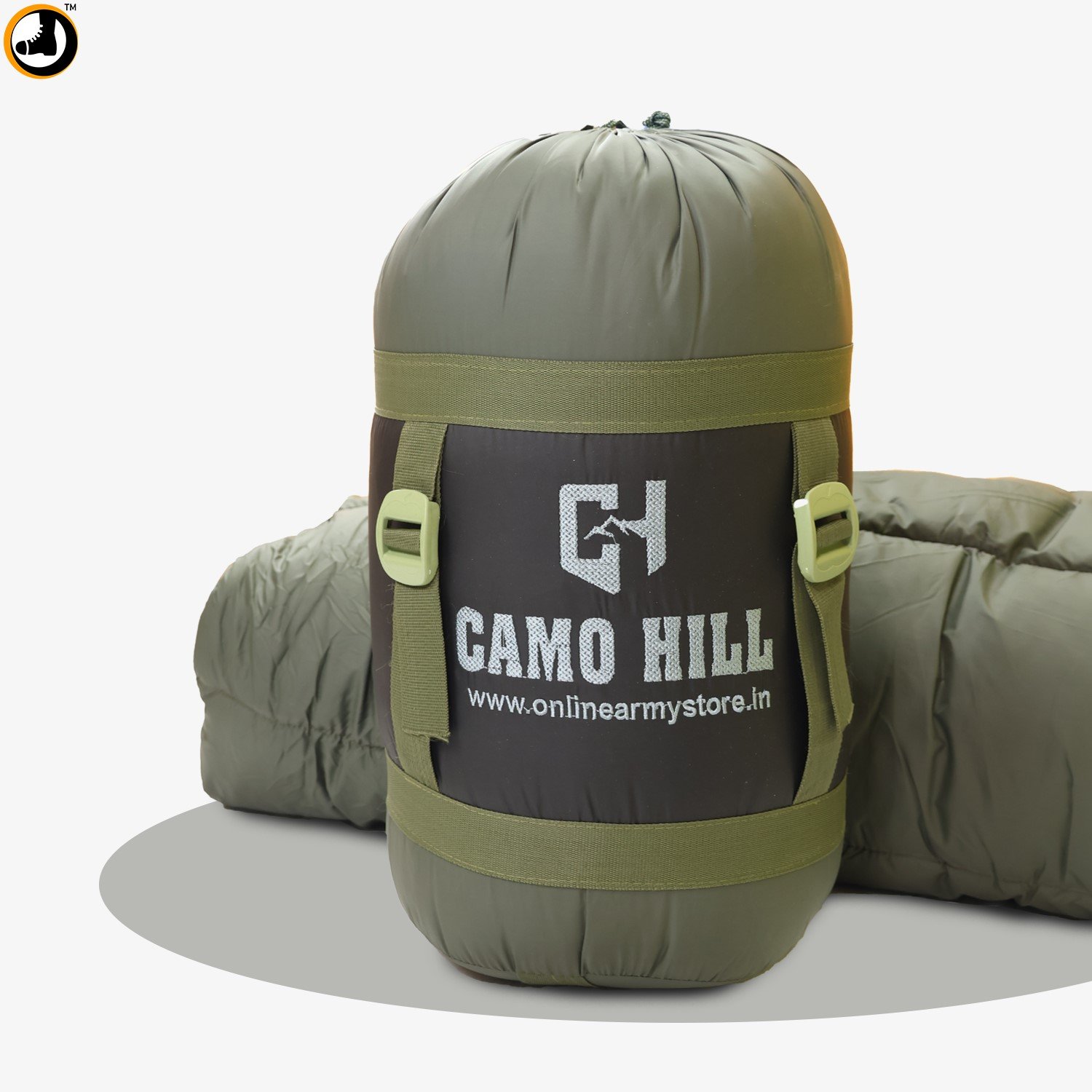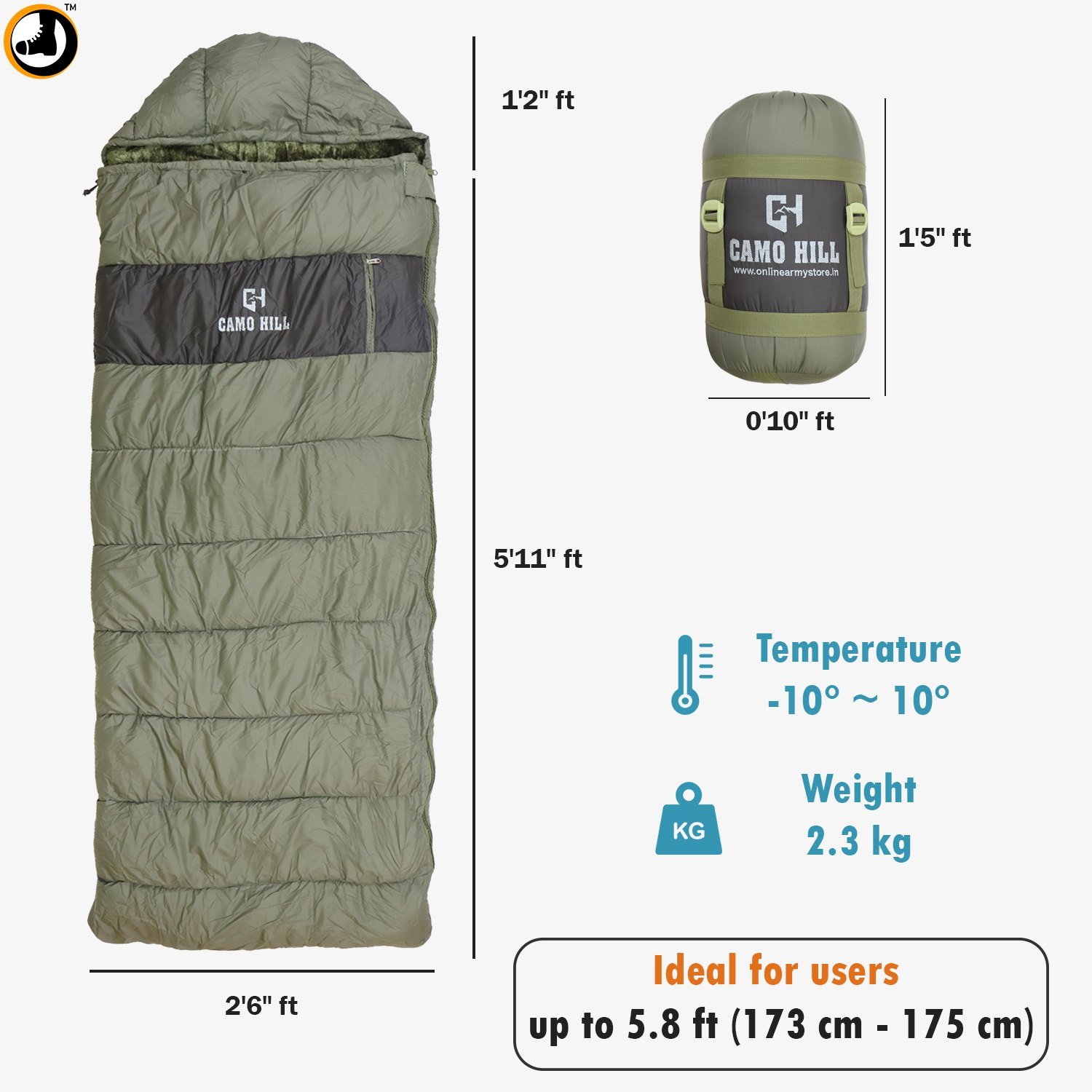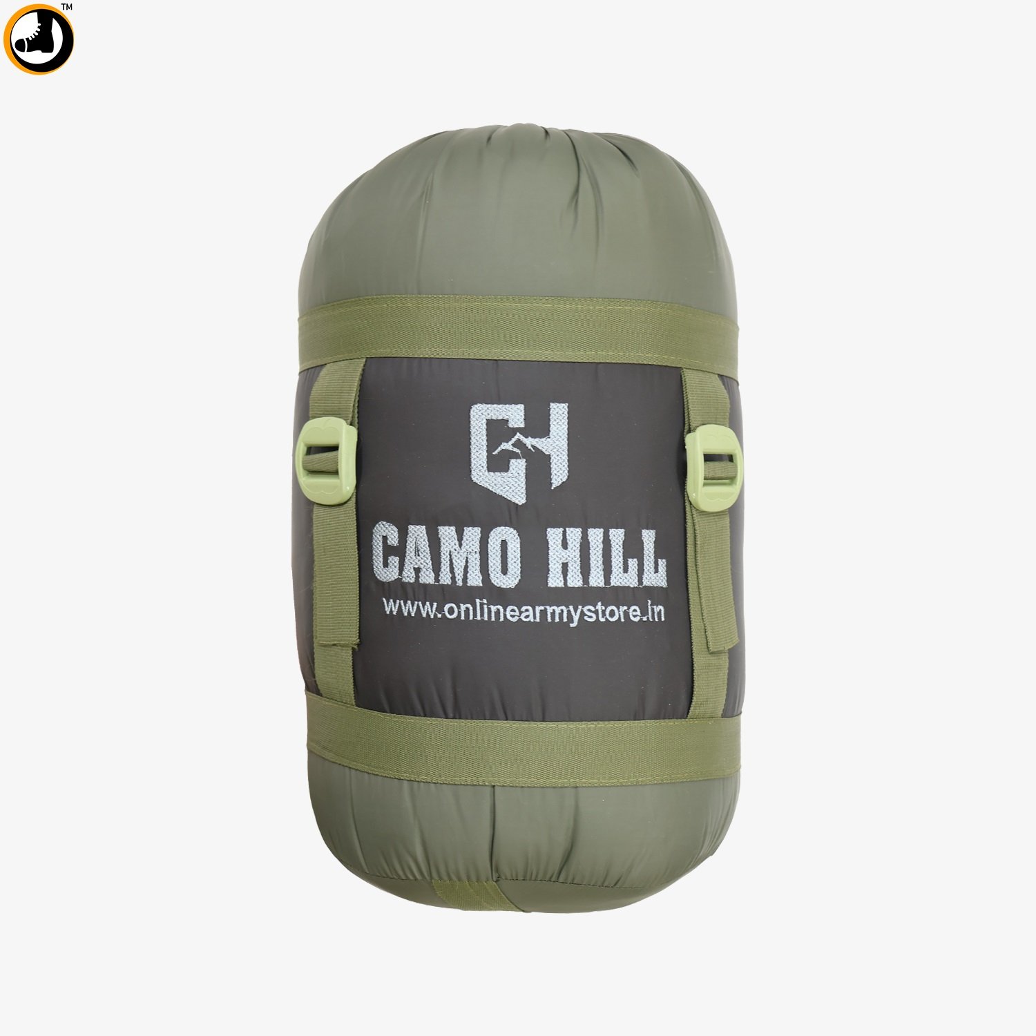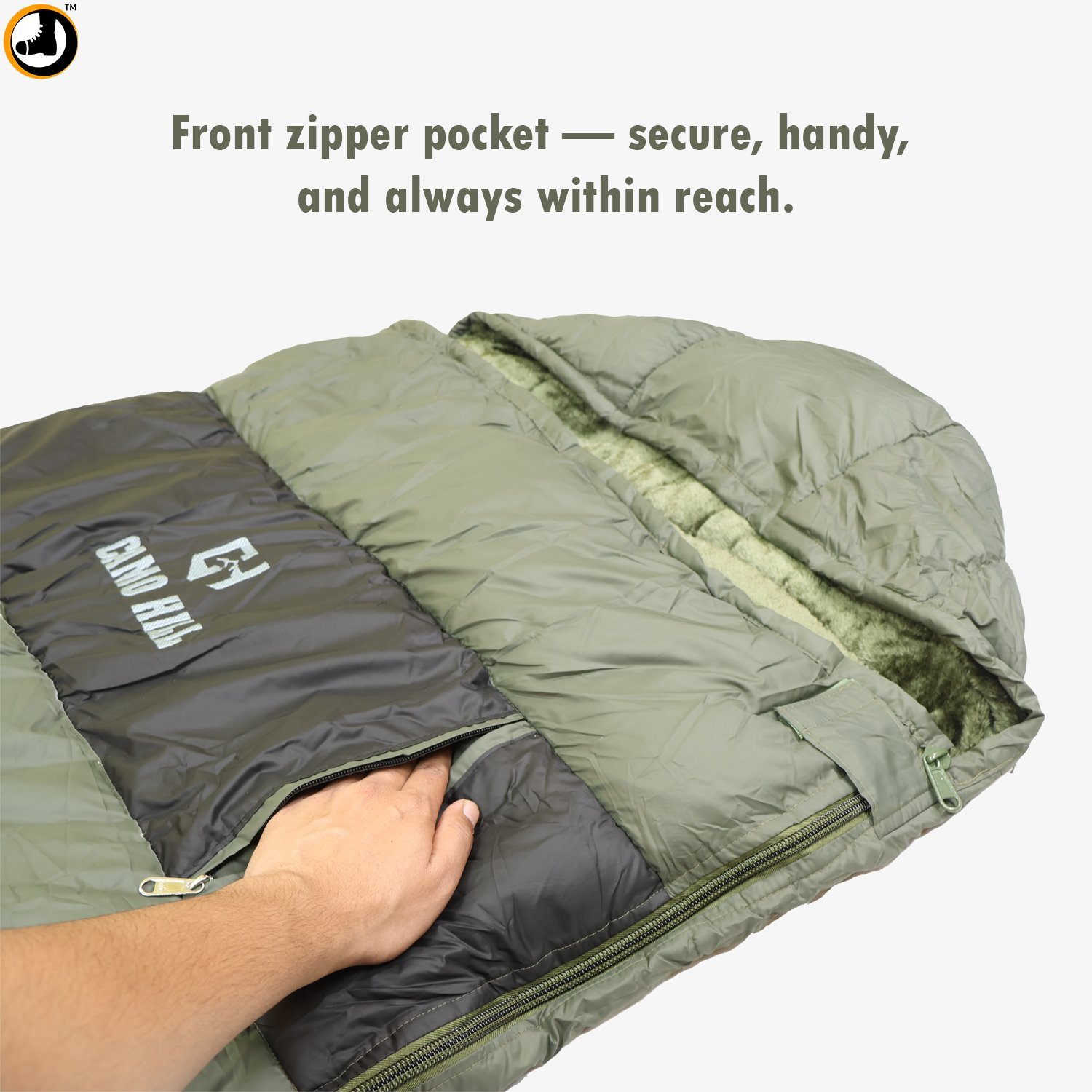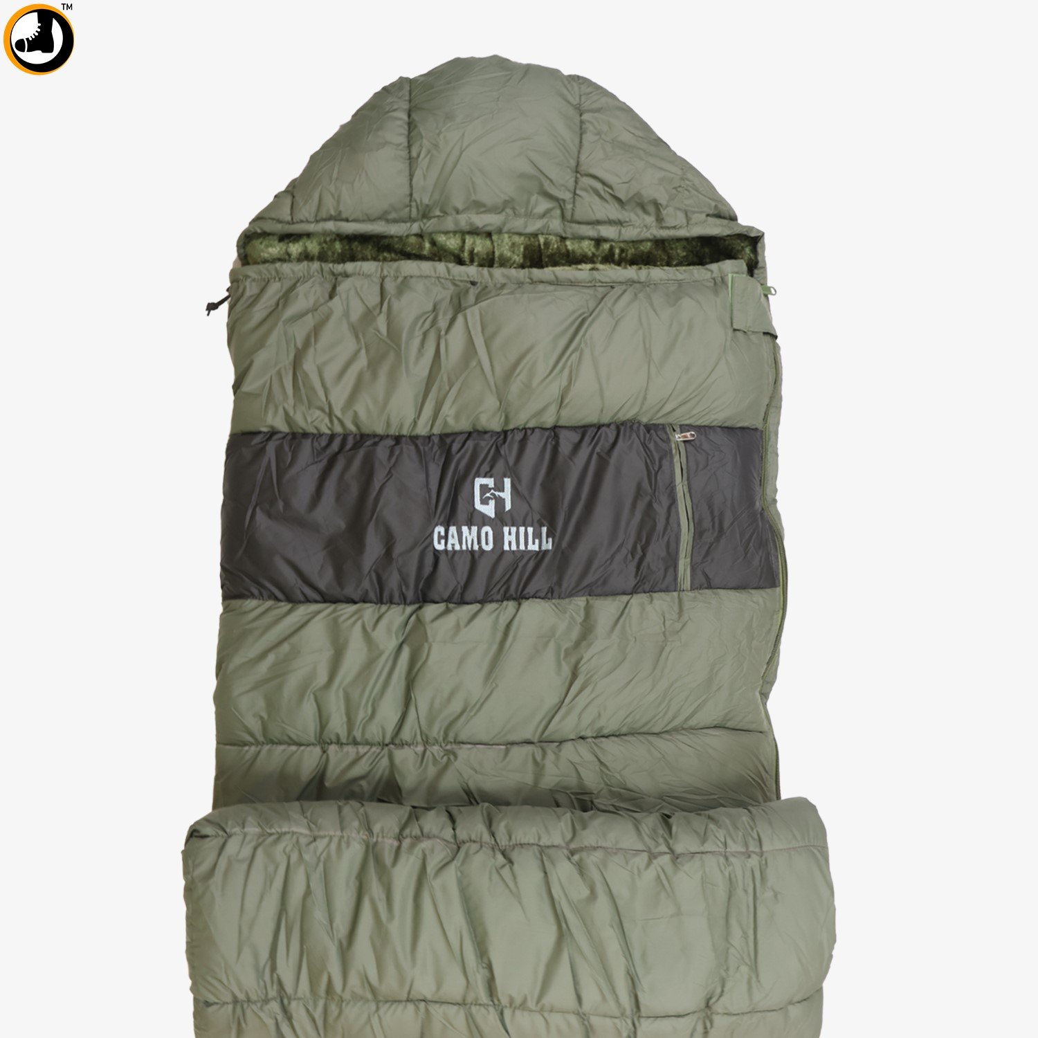 Camo Hill Olive Green Sleeping Bag with Fur Lining, Dual Zippers & Utility Pocket