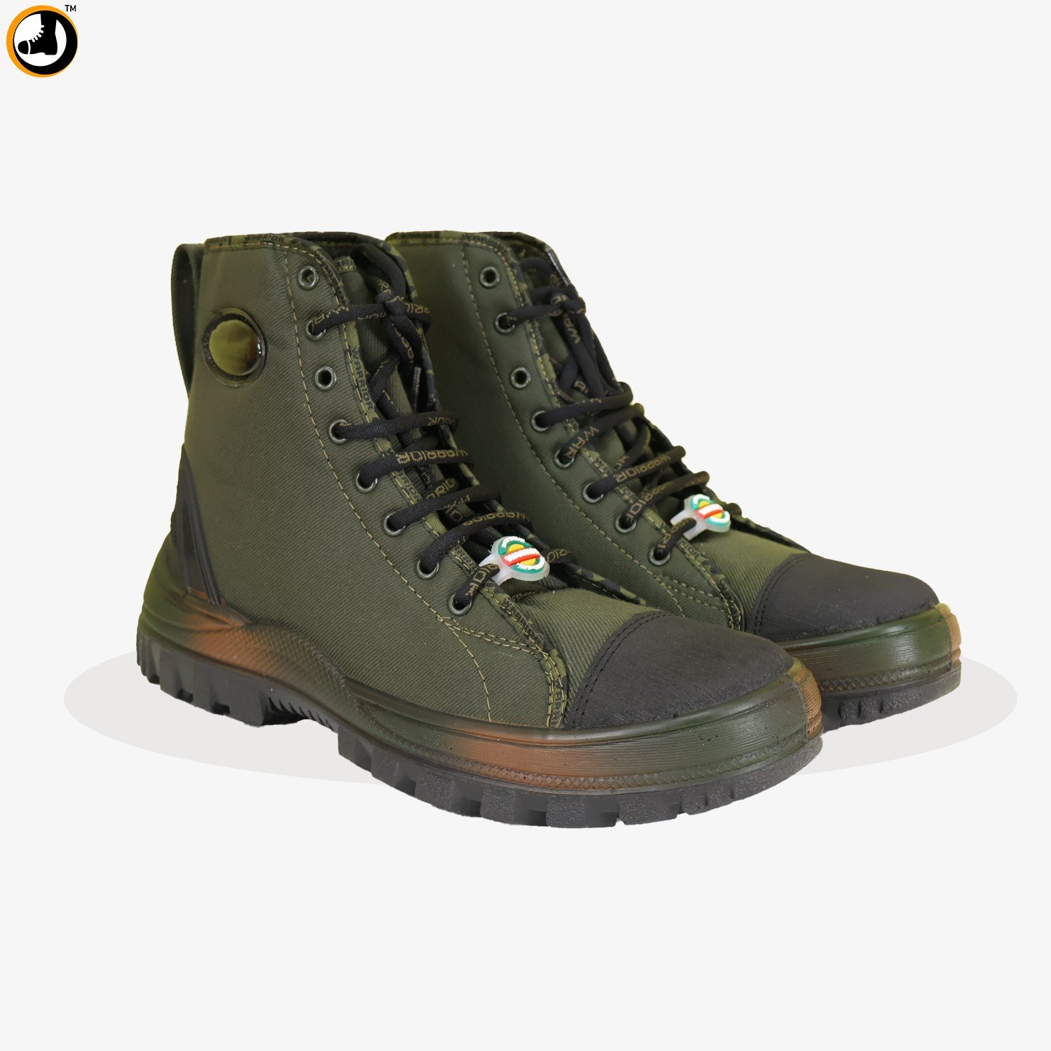 Sturdy olive-green canvas with reinforced toe & ankle protection